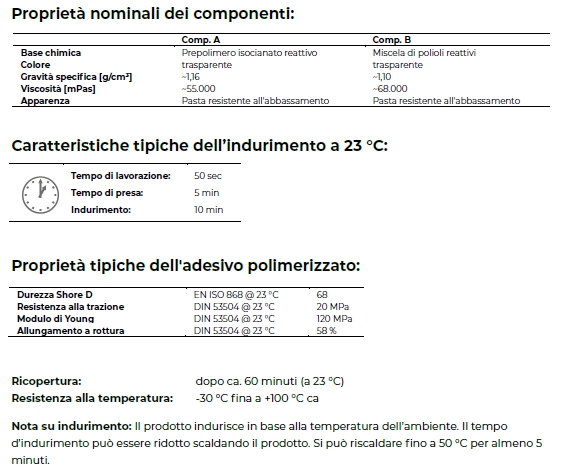 Se il prodotto viene stoccato ad una temperatura inferiore, ovviamente però non di 0 gradi ma comunque tra i 5 e i 14, non ci sono problemi a patto che prima di utilizzarlo venga portato alla temperatura ideale o riscaldato per un attimo. In ogni caso tutti i bicomponenti sul mercato incollano tramite una reazione esotermica (quindi a contatto con il calore dell’aria). Pertanto più è freddo più temp o ci impiegano a indurire perché aumenta la viscosità del prodotto. Si consiglia quindi di riscaldarli prima di utilizzarli, soprattutto nei mesi più freddi dell’anno.