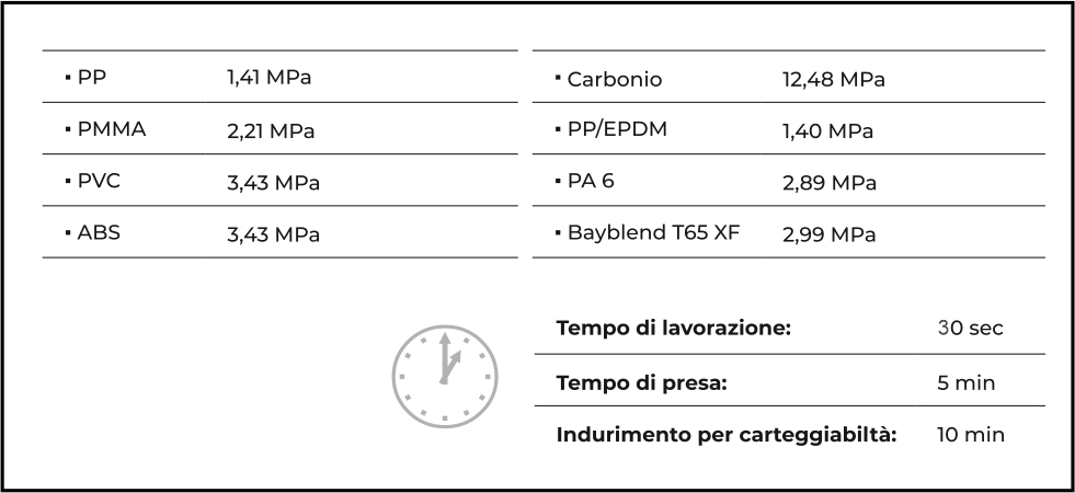 Sforzo / pressione dell’adesivo sui diversi substrati in plastica anche senza primer (con l’uso del primer invece si ha un ulteriore 20 % in più di adesione).